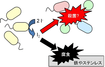 ヨウ素酸化細菌は、ヨウ化物イオン(I−)を酸化して、分子状ヨウ素(I2)を作り出します。この分子状ヨウ素は、強い酸化剤であり、菌を殺したり、金属を腐食したりします。