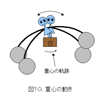 ただ、やじろべえの重心はやじろべえの外にあるため、重心を求めるのはやっかいです。しかも、重心の位置が見えません。これでは、ふらふら動いているときに、重心の動きを追うこともできません。