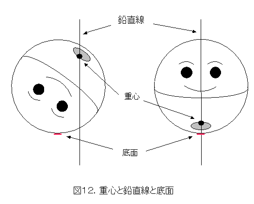 図12をよく見てください。おきあがりこぼしの重心から鉛直線を引いています。理想的には、おきあがりこぼしの体に使ったカプセルは球ですが、実際は完全な球にはなっていません。そのため、底面がある程度の広がりを持っています。図12の左側のおきあがりこぼしは不安定なため、転がって、右側にあるように立ちます。そのとき、重心からの鉛直線は底面を通ります。