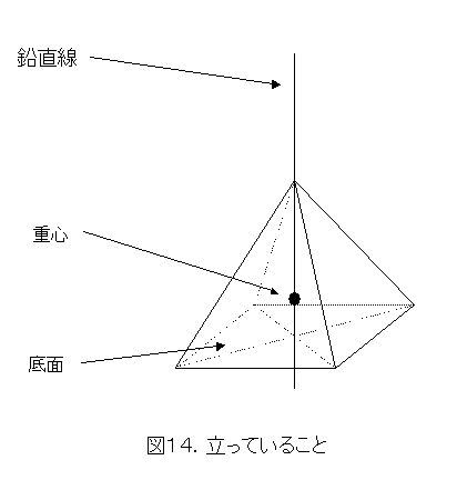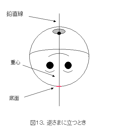 図13は逆さまに立ったおきあがりこぼしです。この状況は、重心からの鉛直線が底面を通るときのみ発生します。もしも、重心からの鉛直線が底面を通らなかったとすると、図12の左側の状況になり、右側にあるように立ちます。これらの状況から、立っているということは、重心からの鉛直線が底面を通るということになります。