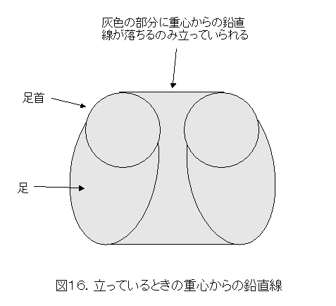 立っていられるためには、図16にあるように、両足のふちとそれらを結んだ直線で囲まれた灰色の部分に重心からの鉛直線が通ればよいことになります。いろいろ体を傾け、重心からの鉛直線の通るところを推定してみましょう。図16の灰色の部分にあるということが分かってくると思います。