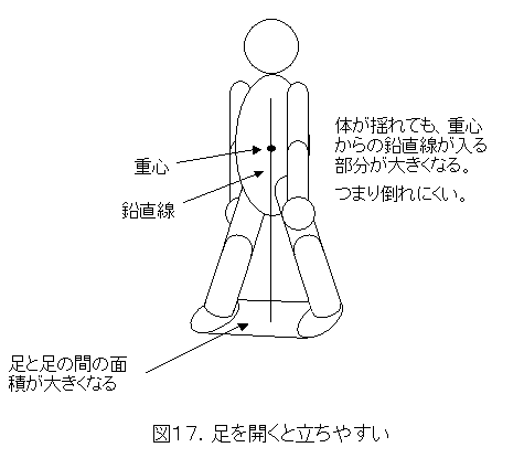 今度は、足を少し広げてみましょう。足と足の間の面積が広くなりますので、立っているのが楽になります。これは、図16の灰色の部分が広くなったため、許される揺れが大きくなるからです。この場合も、体をいろいろ傾けてみましょう。足を広げた場合の方が、傾きが大きくなっても立っていられることを実感するはずです。