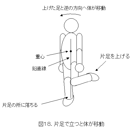 また、鏡の前に立って、片足を上げてみれば解りますが、片足を上げると、上げた足とは逆の方へ体が動きます。いくら体が移動しないように抵抗してもむだです。重心が片足を底面とする部分へ移動することからの必然です。