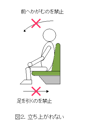 では逆に、足を引くことも、前へかがむことも禁止してみましょう。これで椅子から立ち上がれるかどうか実際に実験してみましょう。
