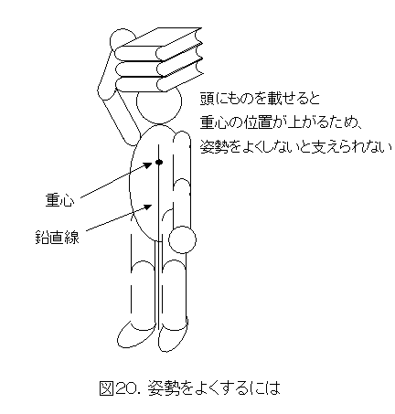人間の場合、重心はへそより20cm位上の背骨の辺りということです。このとき、重心からの鉛直線を引けば、両足の間を通ります。