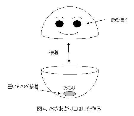 それでは、おきあがりこぼしを作ってみましょう。といっても、たまご型は難しいので、何かもっと簡単に作れる方法がないか考えてみました。ガチャポンのカプセルを使うとよいでしょう。中が見えるので実験にぴったりです。結構、捨ててあったりするので、ただで手に入る可能性もあります。中が見えるということと、ぱかっと開けられ、加工が容易ならどんなものでも問題ありません。図4のように、おもりを接着しますが、これはなるべく小さくて重いものがいいです。