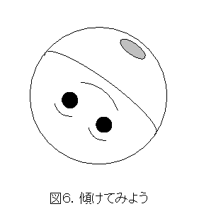 図6のように、いろいろ傾けてみると、おもりの位置が図5の位置より高くなっていることに気づくでしょう。そして、おきあがりこぼしが立つということは、おもりが低い位置へ移動することです。これから、おもりはできるだけ低い位置にあった方が安定していると考えられるでしょう。