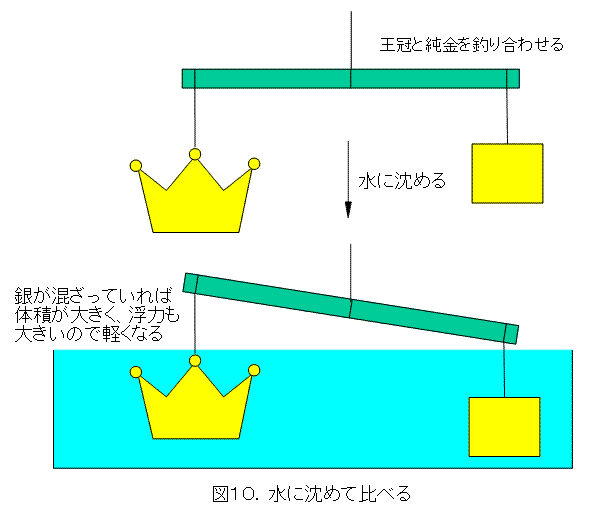 金と銀では、体積が同じなら金の方が重くなります。そうすると、もし銀が混ざっているなら、その分軽くなりますね。具体的には、王冠と同じ体積の純金とくらべて王冠の方が軽くなるはずです。