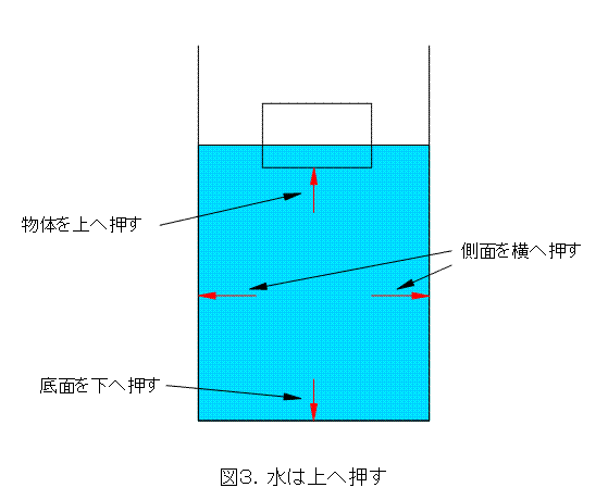 誰でも、水が、容器の底面を下に押し、容器の側面を横へ押していることを知っています。しかし、水は、上へも押しています。発泡スチロールを浮かべてみましょう。いくら軽いとはいえ、重さはあります。ですので、水の底へ沈まないということは、水が下から押していることにほかなりません。ためしに、浮かんだ発泡スチロールを上から押してみましょう。下から押し上げてくる力を感じるはずです。