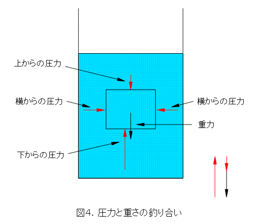 図4のように、物体が水中で静止している状況を考えましょう。まず、横へは動きませんので、横からの圧力は釣り合っています。これは、図4の横の矢印は、反対向きで大きさが等しいということです(以後、横からの圧力は無視します)。しかし、縦の矢印はそうではありません。向きは反対ですが、上からかかる圧力に対する矢印と、下からかかる圧力に対する矢印の大きさが違っています。図4の右下に書いてあるように、上向きの矢印が、下向きの矢印と重力による矢印(重さのこと)をつなぎ合わせた長さにります(釣り合うということ)。