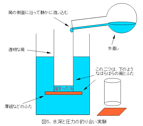大きな容器に水を入れ、図5のように、筒の下にふたをして水に沈めます。すると、接着剤で付けたわけでもないのに、ぴったりくっついてしまいます。圧力がふたを下から押しているからですね。今度は、水差しで、筒の側面に沿って静かに水を流し込みます。すると、外側の容器の水面と、筒の中の水面が一致したときにふたが外れてしまうことを確認できるはずです(ここで、ふたの厚みは無視します。どういうことかというと、ふたの厚みによって、外側の容器の水面と、筒の中の水面の間にちょっと差がでますが、それを無視するということです)。これは何回やっても、どんな形の筒でやっても、筒を浅く沈めても、深く沈めても同じです。