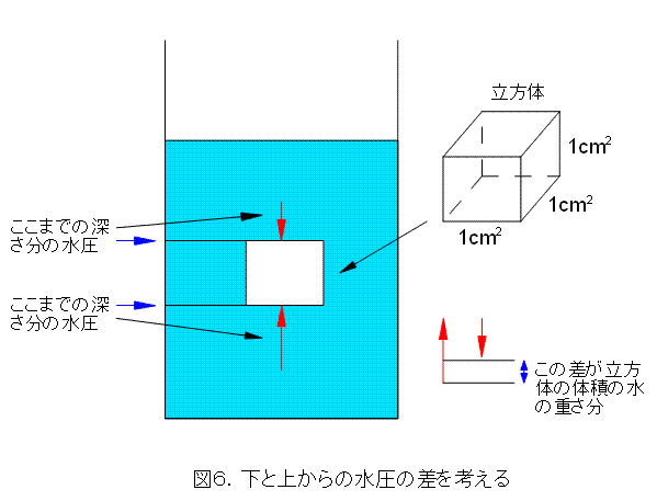 図6の説明にあることを合わせて、物体の下からの圧力と上からの圧力の差は、物体の体積分の水の重さと考えられます。つまり、水中で、物体は自分の体積分の水の重さだけ軽くなるということです。