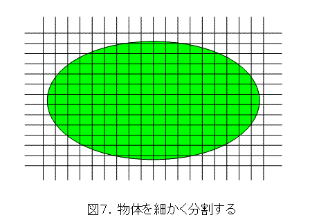 物体を細かく切っていきましょう。図7は平面化して書いてますので、立体図は自分の頭で想像してみてください(イメージトレーニングになります)。すると、へりの近くを除くと、物体は小さな立方体の集まりとなっていきます。どんどん立方体を細かくすれば、へりの辺りの立方体の体積のを足し合わせたものは非常に小さくなり無視できます。そうすると、物体の体積は小さな立方体の体積の総和と考えて差し支えないでしょう。