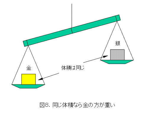 と思ったけど、こんなやり方は面倒なので、もっと簡単な方法を考えましょう。体積を計るのは手間がかかって面倒です。体積を同じにして重さを比べる代わりに、重さを同じにして考えましょう。もし、銀が混ざっていれば、同じ重さの純金よりも体積が大きくなるはずです(図8の下にある説明から解りますね)。