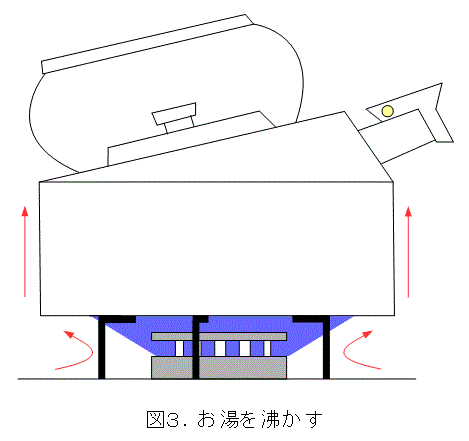 図3のように、お湯を沸かすとき、炎の上にやかんを置きます。これは熱源を極めて有効に活用していますね。炎によって直接暖められるばかりではなく、周囲の空気が暖められ、上昇するときにやかんを包んで流れ、この空気からも暖められます。こうして、炎だけではなく、炎によって暖められた空気をも利用してやかんを暖めているのです。