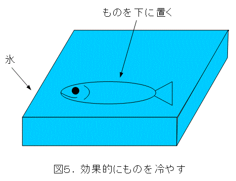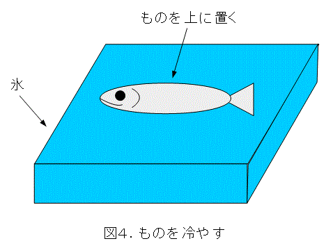 ものを冷やすときはどうでしょうか。図4はよく見かける光景です。氷の上にものを置いて冷やしています。確かに氷と接触している部分は冷えますが、氷によって冷やされた空気を利用していませんね。