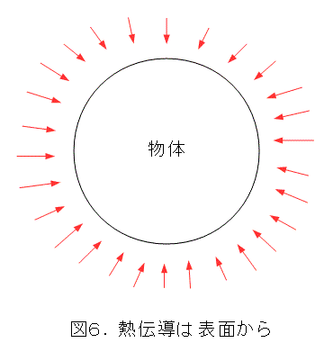 図6の赤い矢印を熱と考えましょう。熱が物体に進入するには、必ず物体の表面からしかできません。直接内部へワープすることなんてありえませんね。