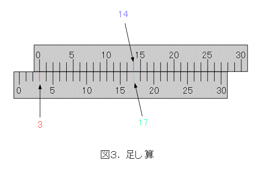 図3のようにして、計算しなくても 3 + 14 = 17 が求まります。引き算もできますので、自分で考えましょう。