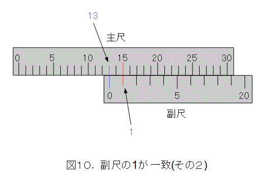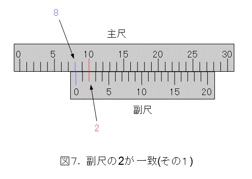 では、一致した目盛から何がいえるのかを考えましょう。図6のような場合です。以下、ノギスで考えていることをお忘れなく。ついでに、図2の青丸を測っているとイメージしましょう。