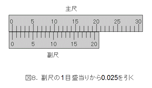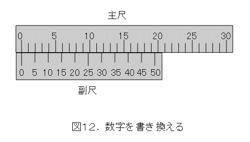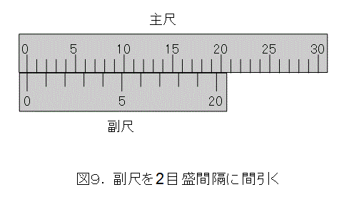 さて、図8へ戻って、副尺の目盛を2目盛間隔に間引きましょう。これは、精度0.025ミリメートルを半分の精度0.05ミリメートにしたものと同じです。したがって、目盛の幅を広げて精度はそのままです。