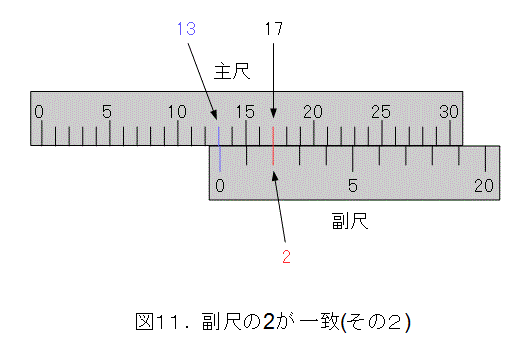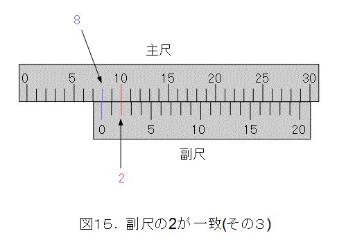以下同様にして、とにかく、副尺の目盛り線が一致すれば、長さが求まります。