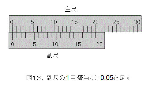 1.05ミリメートルを20倍すると丁度21になるので、副尺の20目盛は、主尺の21ミリメートルのところと一致します(もちろん主尺と副尺の0を合わせる)。これで、副尺の目盛は、21ミリメートルを20等分すれば作れることが解りました。