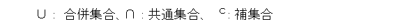 まず、集合に関する演算から見ていくことにしましょう。色々あるが、ここで使うのは、合併集合、共通集合、補集合です。書き方も色々あるのだけど、次のように書くことにしましょう。