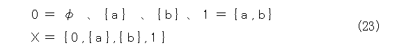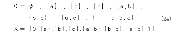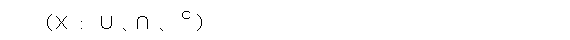 具体的には、まず、全体集合をXとします。このとき、Xは少なくとも2個以上の要素を持つとします( 0 と 1 があって、しかも異なっていないと面白くないから)。そして、演算が3種類定義できているとします(ろくな記号がないので、演算記号は合併集合、共通集合、補集合のものをそのまま使う)。