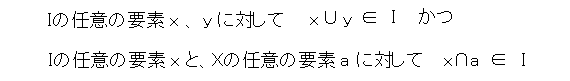 Xの空でない部分集合Iが次のイデアルの性質を満たすとき、Iをイデアルと呼びます。正確にはこれ。