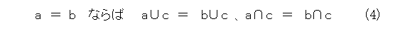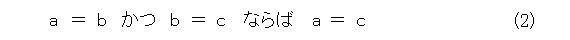 ところで、等号について、当たり前と思い、何も考えていない人も多いでしょう。折角なので、等号についても考えます。ここでは、以下の4つの性質を満たす関係が等号です。(それにしても、ろくな記号が用意されてない上に文字化けしやがる。余計な手間がかかってたまらん。)