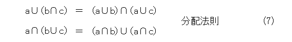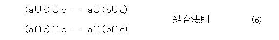 はじめに、集合について、次の性質が成り立ちます。自分で、ベン図を描いて確認するなり、証明するなりしましょう。なお、結合法則が成り立つので、適当に( )は省略できるようになります。それから、一々書きませんが、ある集合の部分集合の全体で演算を考えています(要するに、全体集合は固定して、その部分集合しか考えていないということ)。