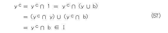 となり、また、Iは極大イデアルなので、Yは 1 を含むイデアル、つまりX自身になる。ということは、Xの任意の要素は、適当に y より小さい要素 x と、適当にIの要素 a を取って、式(51)の形に書くことができる。特に、Iの要素 b を適当に取って、