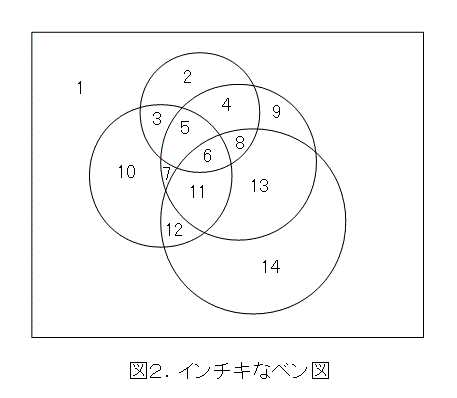 4つの集合があれば、できる領域(集合)は2の4乗(16)になるので(領域の数の求め方は読者の宿題)、この図はインチキです。そもそも、円4つでは16個の領域(集合)を作れません。もちろんこの証明は読者の宿題です。