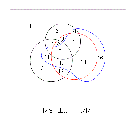 ここまでの考察で、図3みたいに4個の集合相手では、結構複雑になること、また、空集合に対してはあまり有効ではないことを考慮に入れ、ベン図は1個から3個までの集合に対して有効な手段と考えるべきでしょう。もちろん、4個以上でも、一般的な集合を描くのでなければ有効な場合もあります。