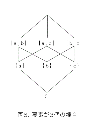 こうして、有限ブール代数は、原子の全体がつくるべき集合と同型になりました。このとき、原子全体の個数を n とすると、このべき集合の要素の数は、 2 の n 乗です。ついでに、有限ブール代数の要素の数は 2 のべき乗しかあり得ないことまで解りました。