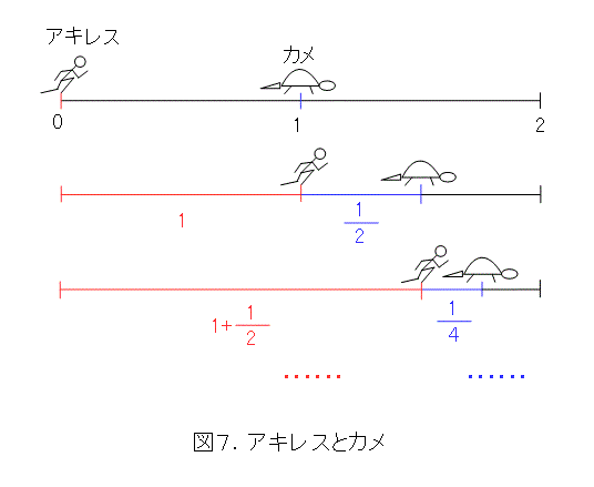アキレスが、最初にカメのいた位置、つまり1だけ進むとカメは1/2だけ進みます。次に、アキレスがそのカメのいた位置まで進むと、カメは、更に1/4だけ進みます。以下同様で、無限の操作を行うため、いつまで経ってもアキレスはカメに追いつけません。これが、通常、言われているゼノンのパラドックスです。