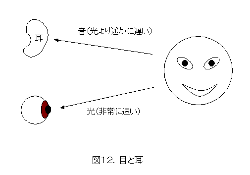 会話するときは、相手の唇の動きに合わせて声が聞こえてきますね。これは不思議な現象です。図12のように、光が目に届いてから、遅れて声が耳に届きます。同時に来ているわけではないのに、なぜか唇の動きに合わせて声が聞こえます。ということから考えて、脳は、光と音を感じるずれを補正し、無理やり同期を取っているということです。物音でもなんでも、光と音の同期がとられて感じます。素晴らしい処理系ですが、逆に、これを利用して錯覚を起こさせることもできます。それら辺については自分で勉強してみるとよいでしょう。