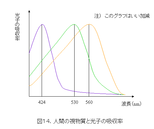 図14は人間の目にある視物質での光子の吸収率曲線を描いたものです。nm(ナノメートル)という単位が出てきますが、これは10億分の1メートルです。人間の目にはそれぞれ、424nmのところで一番吸収されやすいもの、530nmのところで一番吸収されやすいもの、560nmのところで一番吸収されやすいものの三種類があります。グラフは縮尺も、それぞれの山の高さもいい加減ですが。