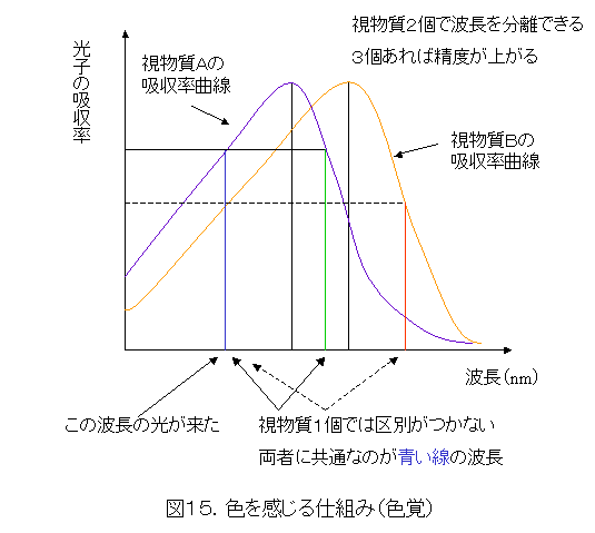 それでは、二種類の視物質によって光の波長を捉える方法を考えてみましょう。図15を見てください。視物質Aと視物質Bの吸収率曲線が書かれています。そこで、例えば、青い線で書いたところの波長を持つ光が来たとします。このときに、視物質Aでは青い線と曲線の交わった部分に対応する割合の光子が吸収されます。しかし、図15を見れば解りますが、緑の線で書いた波長を持つ光子の吸収率と同じになります。従って、視物質Aでは、青い線の波長の光と、緑の線の波長の光とを区別できません。