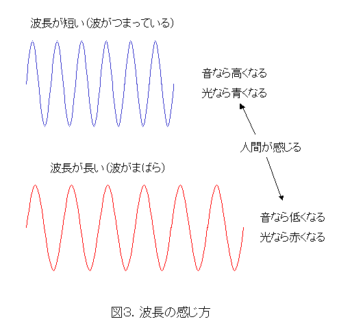 図3にあるように、音ですと、波長が短いと、音を高く感じますし、波長が長いと、音を低く感じます。光ですと、波長が短いと、青っぽく感じますし、波長が長いと、赤っぽく感じます。この感じるというところがミソです。当然、脳が感じるということですので、感じ方には脳を介在させなければなりません。一応、「脳が感じる」ということを覚えておいてください。