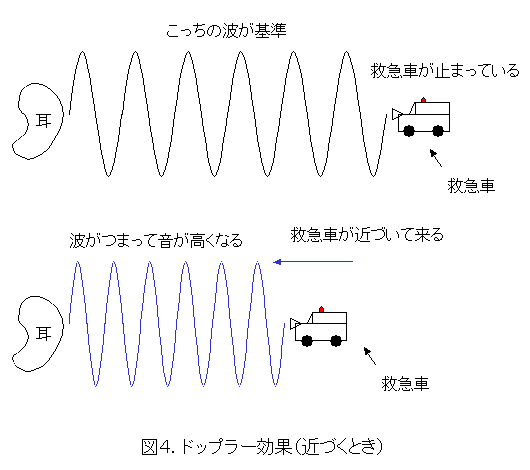 図4を使ってこの現象を説明しましょう。図4の上の方の図は、救急車が止まっているときにサイレンを鳴らしている図です(止まっているときはサイレンを鳴らさないよ)。これは、最初の音が丁度耳に来て、最後の音がサイレンから出たばかりの状態と考えてください。下の図は、救急車が耳の方に近づいてきたときの図です。当然、最初の音は、丁度耳のところへ来ますし、最後の音は救急車のサイレンのところですね。途中の音は、耳とサイレンの途中にありますので、図にあるように波がつまってしまいます。すると、波がつまって波長が短くなるので、音は高くなります。
