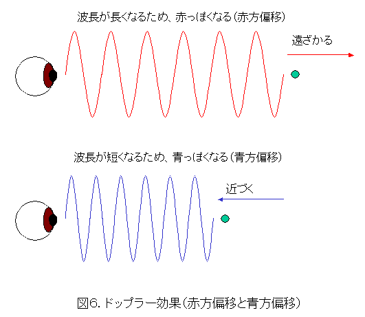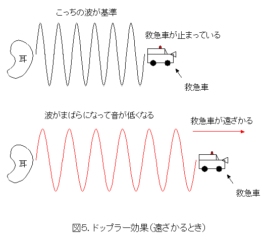 図5は逆に救急車が遠ざかっている図です。この場合は、波がまばらになり、波長が長くなりますので、音が低くなります。このように、動いているものから来る波は、その動きによって波長が変化します。この現象をドップラー効果といいます。