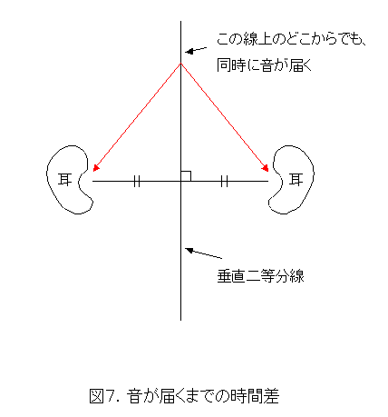 真正面からでも真後ろからでも同時に音が到達しますので、時間差では区別がつきません。平面上で考えるなら、図7のように、二つの耳の間の垂直二等分線上から来た音は全部同時です。