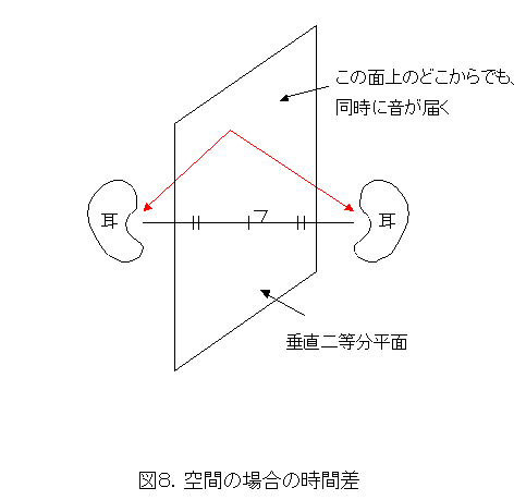 図8にあるように、二つの耳の間にある垂直二等分平面の上のどこから来ても同時に感じてしまいます。これでは、獲物を取ることも、敵から逃げることもできないでしょう(どっちへ行けばいいのか解らないから)。