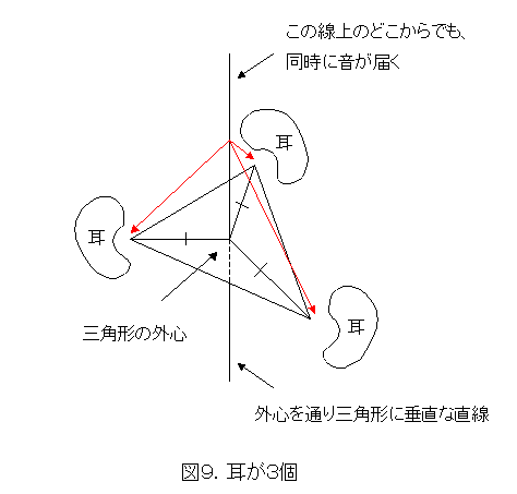 今度は、三つの耳の作る三角形の外心を通って、この三角形に垂直な線上から来た音は全て同時に聞こえてしまいます。まあ、さっきは、平面だったのが直線になったので、少しはましですが、やっぱり獲物を捕らえたり、敵から逃げるのには支障があります。